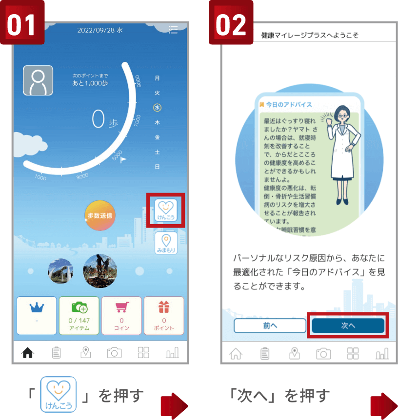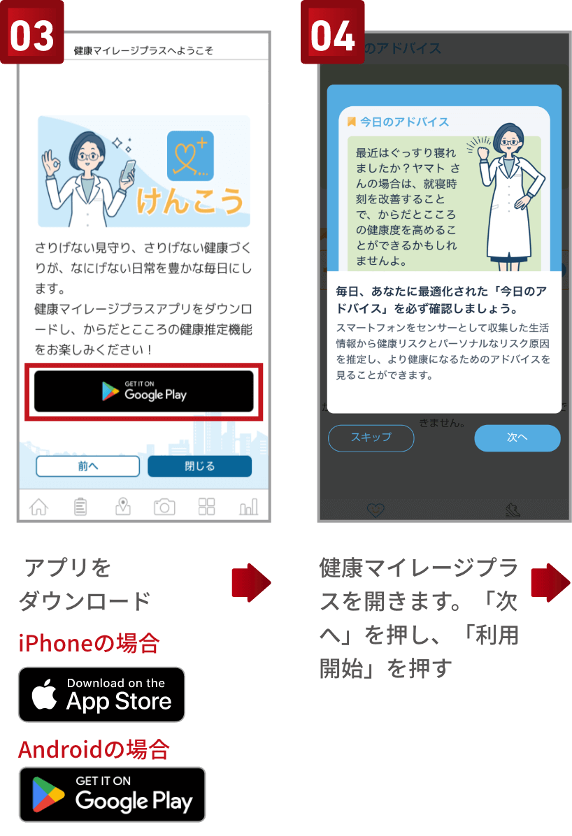 参加方法Google Play、App Storeから「健康マイレージ」と検索、
