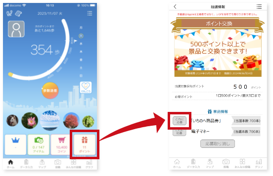 ・アプリ内の抽選情報画面から「いちのへ商品券」か「電子マネー等」を選択できます。(※)