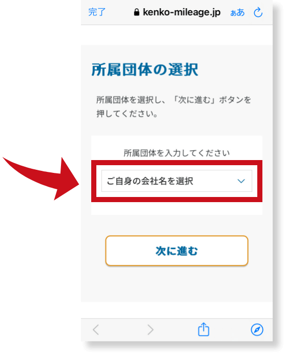 町内に事業所がある企業へお勤めの町外の方は、所属団体の選択の画面で【ご自身の会社名】を選択してください。(地区は選択しないでください)