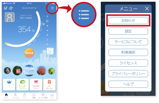 メニュー一覧が表示されるので「お知らせ」をタップするとご覧いただけます。
